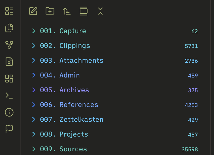 I grew up with Windows, so my default organisation format is folders. I try to organise them with a three-level deep maximum, and I have adapted a version of the Johnny Decimal numbering. Some level one folders don’t have folders inside, like Zettelkasten, for example. Others, like Projects, have more.