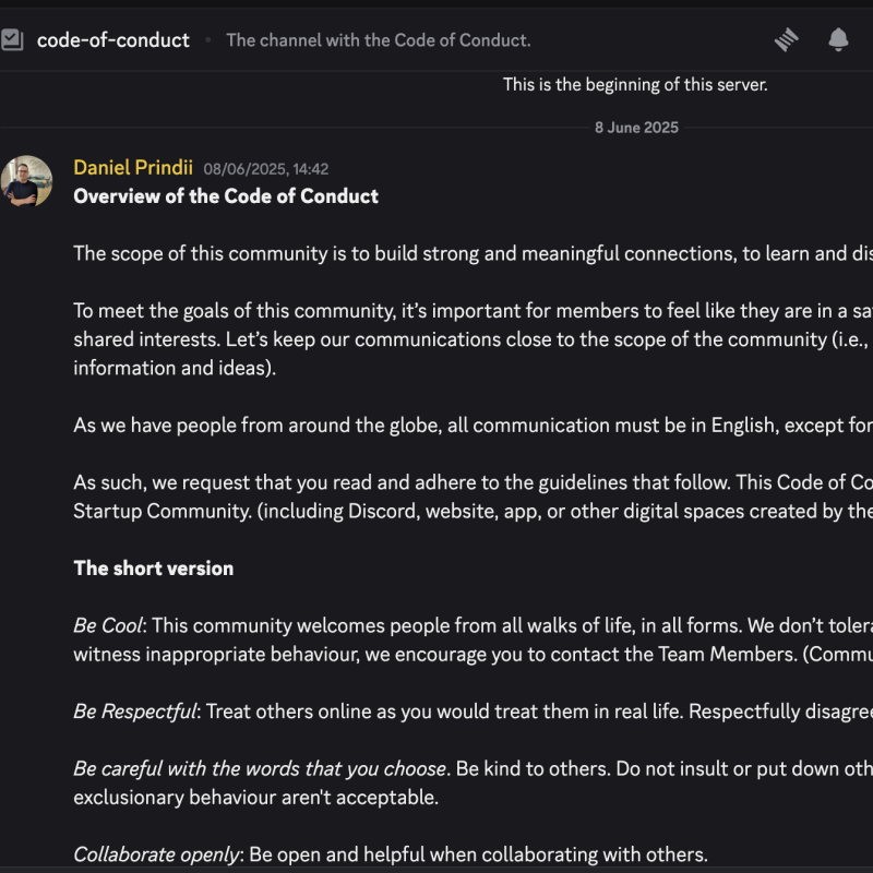 A Code of Conduct that covers online activities and in-person activities.