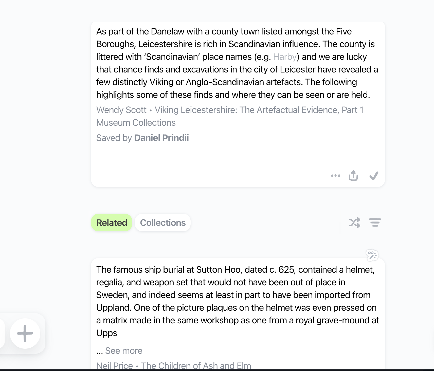 The discovery part comes from the public library- a curated list of cards that you decide to make public, and from the recommendations engine. For example, I saved a card with information about the Viking Leicestershire, and the first recommendation is a card with a fragment from Neil Price's book “The Children of Ash and Elm”.