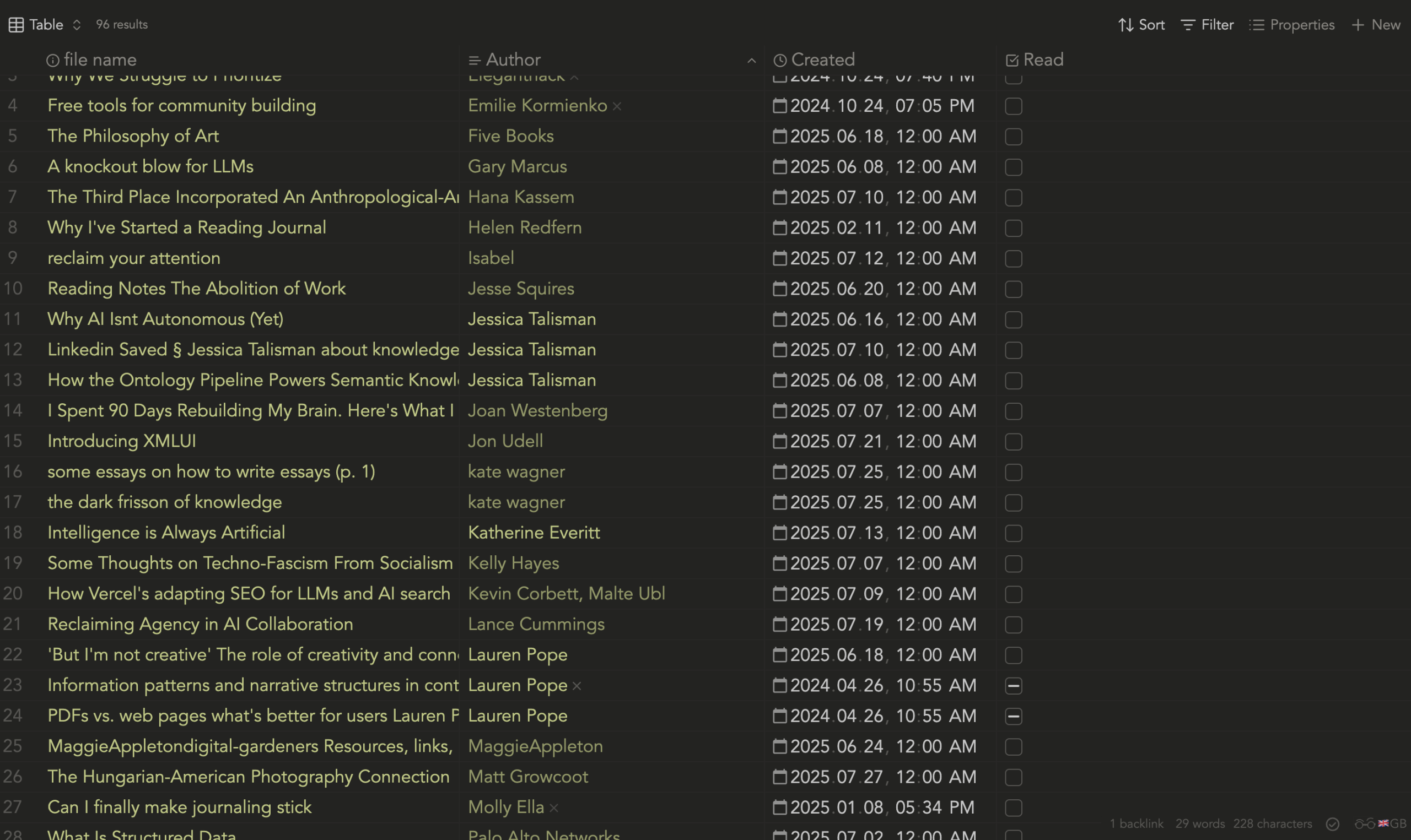 For my saved items, I run a simple database based on the ToRead and Read checkboxes. Of course, you can sort and filter based on the other metadata information like Author, Publish Date, Created Date or any other information you have there.